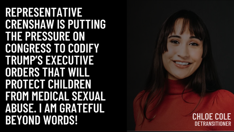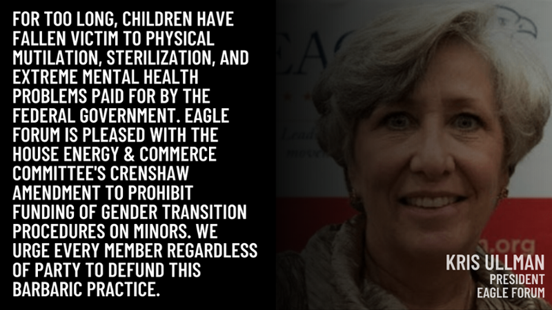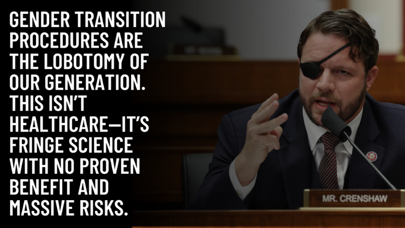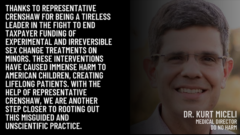 The Crenshaw Amendment bans the use of Medicaid, CHIP, and Affordable Care Act funds for ALL so-called "gender-transition procedures." That includes puberty blockers, cross-sex hormones, and irreversible surgeries like double masectomies and genital reconstruction.